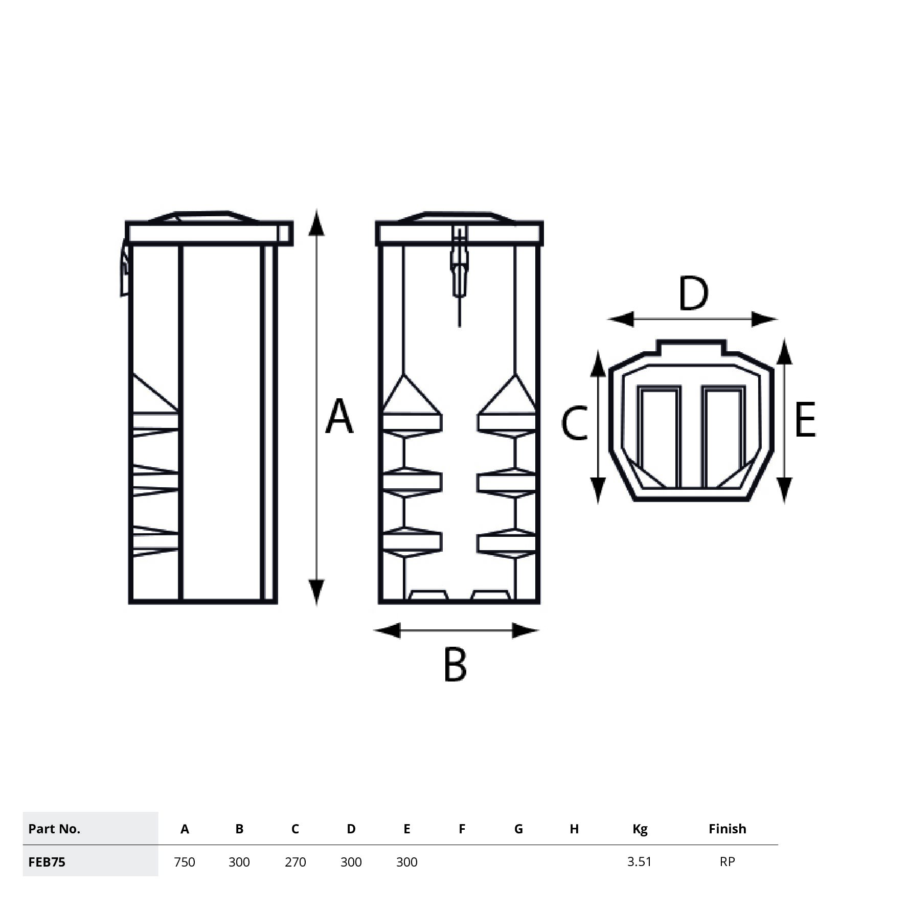 • Manufactured from medium density recyclable polyethylene. • For 6kg extinguisher FEB65. • For 9kg extinguisher FEB75.